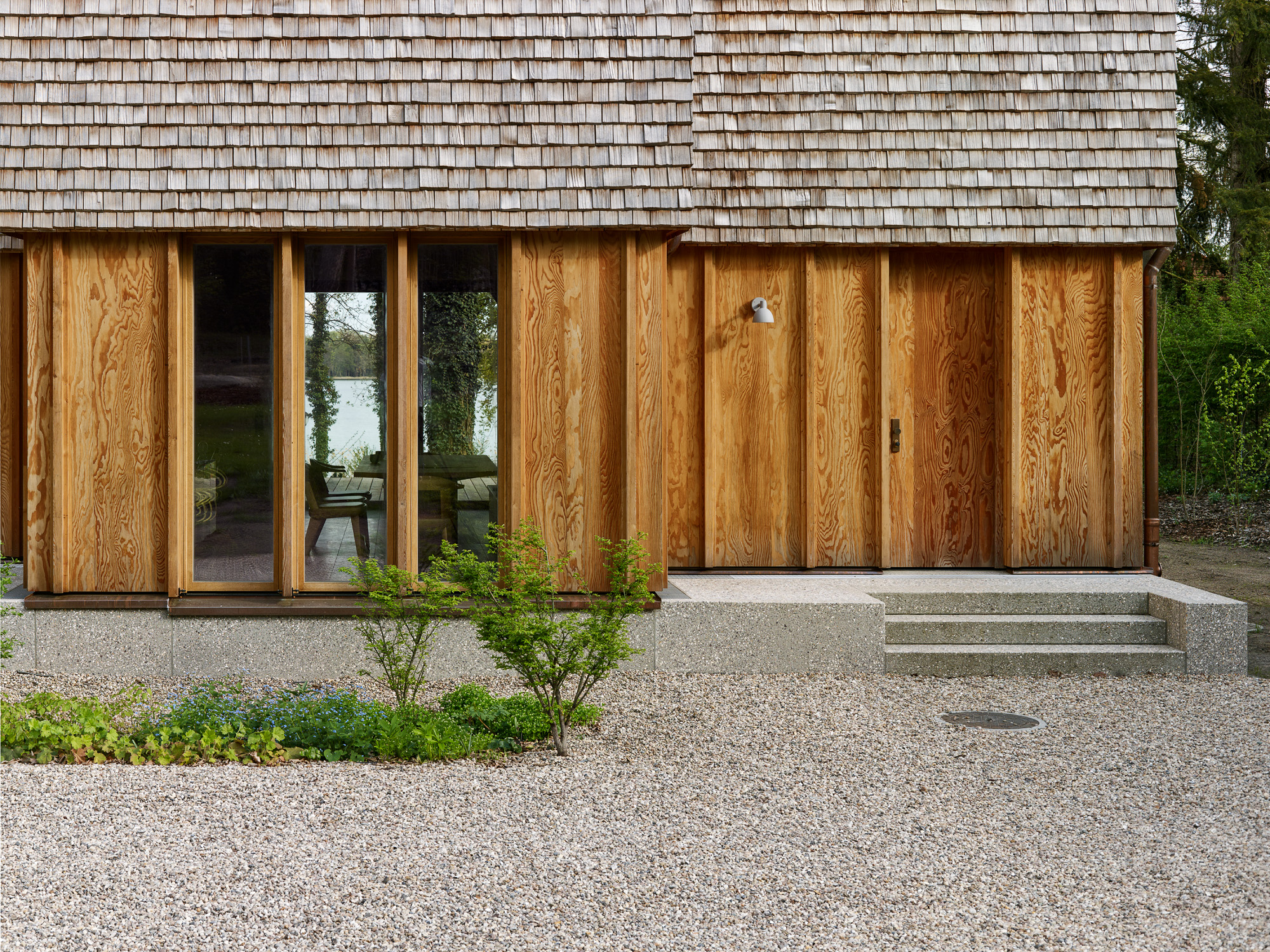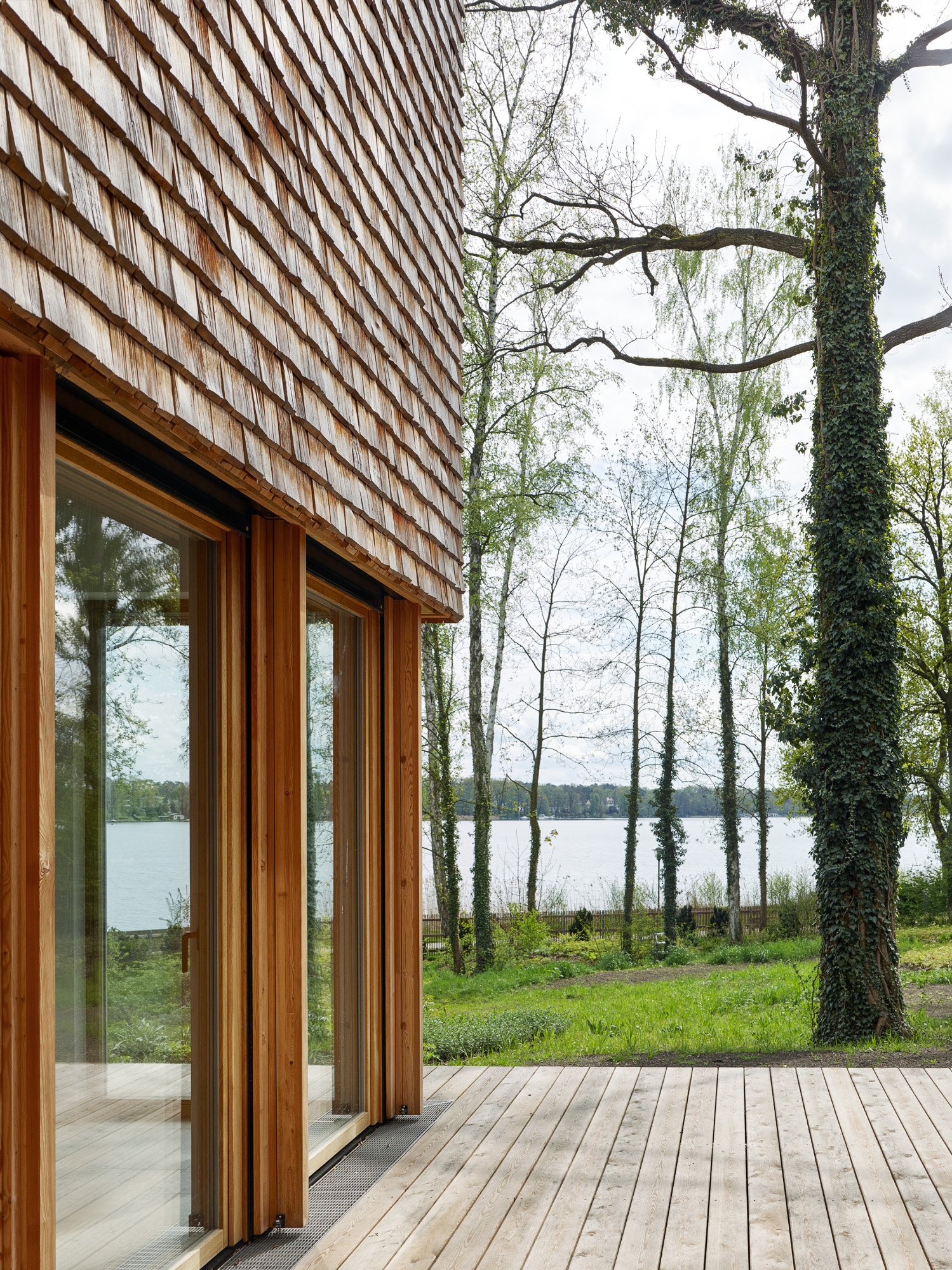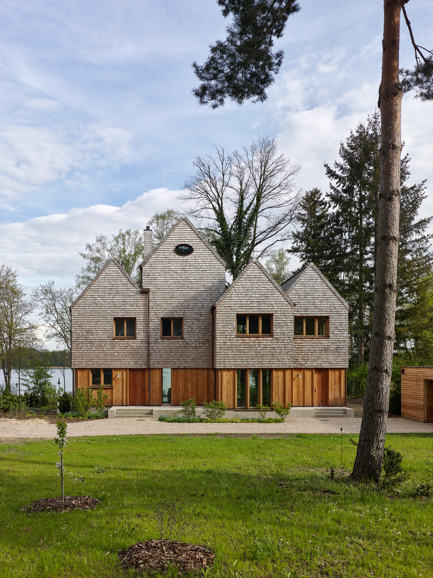 Selten hat man im Leben eines Architekten die Möglichkeit ein Haus zu bauen, bei dem die Lage, die Vorstellung des Architekten, die gewählten Materialien und der Geschmack der Bauherrschaft, einer jungen Familie mit zwei kleinen Kindern, in perfektem Einklang stehen. Der Baukörper liegt am Ufer des Scharmützelsees in Bad Saarow und besteht aus vier leicht verschobenen Satteldachhäusern, die an die Fischerhäuser am See erinnern.